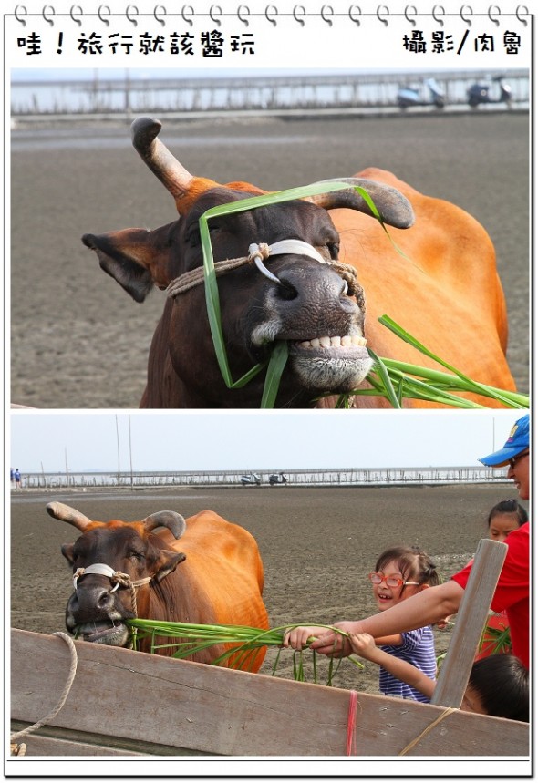 ▲瘋狂立子木結束後,整個海牛車體驗活動也接近尾聲,蚵農分給大家牧草餵食海牛,超級近距離的餵食海牛,是不是很像是去牧場時拿牧草給乳牛吃的景象呢,但是牧草不能碰到沙子喔,這樣海牛就不會吃啦,小朋友有的很害怕有的很開心,牛一吃就要馬上放手不然會被牛拉走喔。