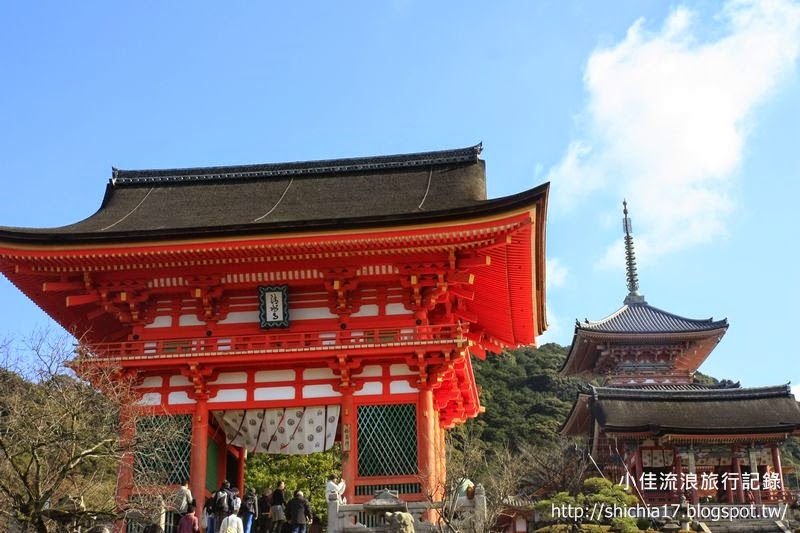 抵達清水寺最先見到的是仁王門,亮紅色切妻式建築豎立(屋簷較長,是日式傳統建築)。v現在看見的仁王門是在2003年時被修復重建,之前顏色並不是如此的鮮豔。