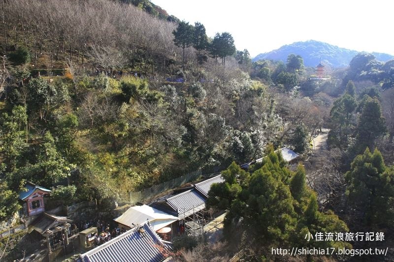 所以雖然很多人到過清水寺,但真正進入本殿的人應該也是部分;只是清水寺的美,要進入才能真正體會。 買票進入後即會看到觀景台,可以欣賞清水寺的風景;冬天只剩凋零的枯枝,但被群山環繞的清水寺實在很美,我想秋天來時整座山會被紅色的楓葉覆蓋,一定很美。 觀景台旁邊就是日本相當有名的清水舞台,有句諺語“清水の舞台から飛び下りる“。