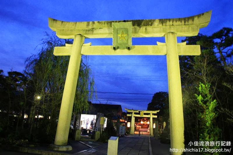 雖然天黑了有些可惜,下公車後直走看到石頭的鳥居打上黃燈,詭譎綠色的鳥居與天空充滿了神秘氣息。