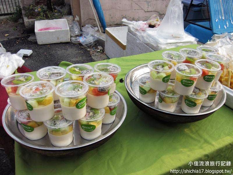 週日夜市吃的東西很多,有很多稀奇的食物。像是木頭的泡冰機、色彩鮮豔的蔬果汁和動物形狀的包子,當然也是有比較常見的甜點,像是水果奶酪等。