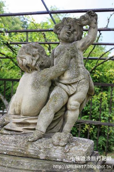 歐洲的宮廷花園都滿常看到這種草剪成門狀的牆,可以想像公主王子在這玩追逐奔跑遊戲的畫面(這裡是主教宮也不會有)。這裡有許多的石頭雕像,右邊的小孩拿著蘋果,不知道這是不是亞當與夏娃。