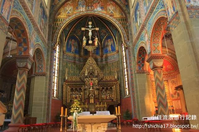 查資料後才知道,東羅馬帝國帝國的遺跡多位於現今的君士坦丁堡、中東、波斯、土耳其和伊朗一代,所以能有幸在南德黑森林的小鎮看到拜占庭風格的教堂,真的是讓人充滿驚喜。其中波浪狀和粗橫條構成的梁柱,不規則的線條,圓弧狀的屋頂等就是拜占庭建築經典的風格。