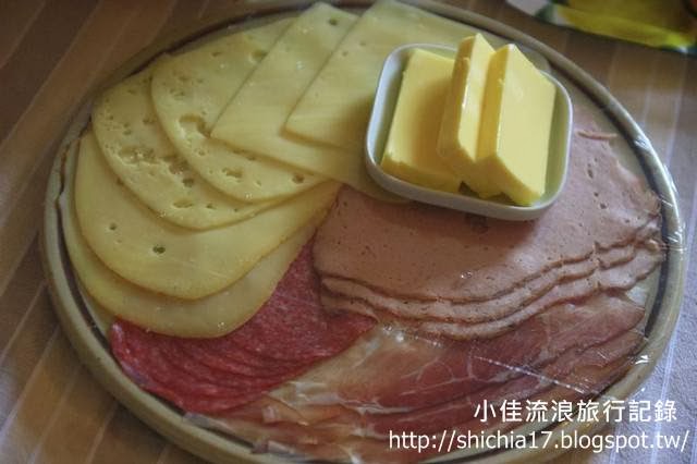 吃最多起士、火腿的時候是在黑森林小鎮Triberg住的Hause Brike民宿,每天早上老闆娘都會把這樣一整盤的起士、火腿與奶油放在我們的餐桌上,這盤子上有三種不同的起士,差別在濃郁和鹹的程度,但不論是哪種都很好吃。