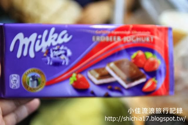 不知道各位有沒有印象,小時候有一陣子很流行一種紫色包裝,裡面是包草莓愛心形狀的巧克力?就是下面左邊那張照片的牌子,只是這種巧克力在台灣消失好久了,在德國看到的時候好開心,雖然味道偏甜,但草莓味和巧克力味都超濃郁,好好吃,我大概一天半就會吃一條。另外德國很有明的就是軟糖,有很多的特殊造型,像是藍色小精靈,只是口味就比較不合了。