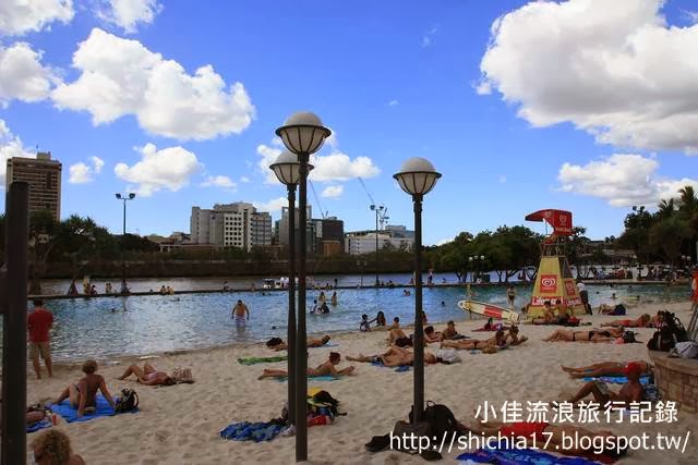 藍天白雲下坐在帥哥猛男和比基尼辣妹的旁邊,真的會讓人有在真正沙灘的錯覺。很難想像在布里斯本的市中心可以有這樣的沙灘和空間讓民眾玩水與休憩,在這邊玩整個下午也是非常開心的事情呢!