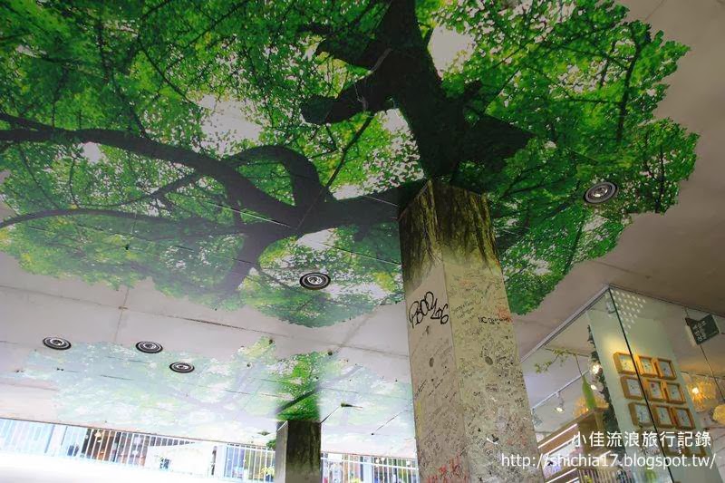 一樓大廳有些人造樹,樹幹的柱子上寫滿了遊客的簽名,延伸到天花板是彩繪的樹。