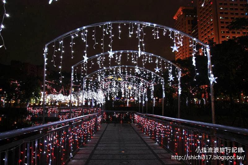 好像大部分的人到聖誕城都是直接從板橋捷運站往市府廣場走,因此這附近的人潮實在不多,可以慢慢的拍。這公園有幾個水池,燈飾的倒影在水中,讓這的夜晚顯的更美麗。
