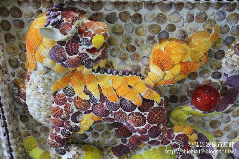 廟宇的整面牆都是以貝殼砌成,以白色為基底和紫色、紅色、橘色等鮮艷顏色當點綴。