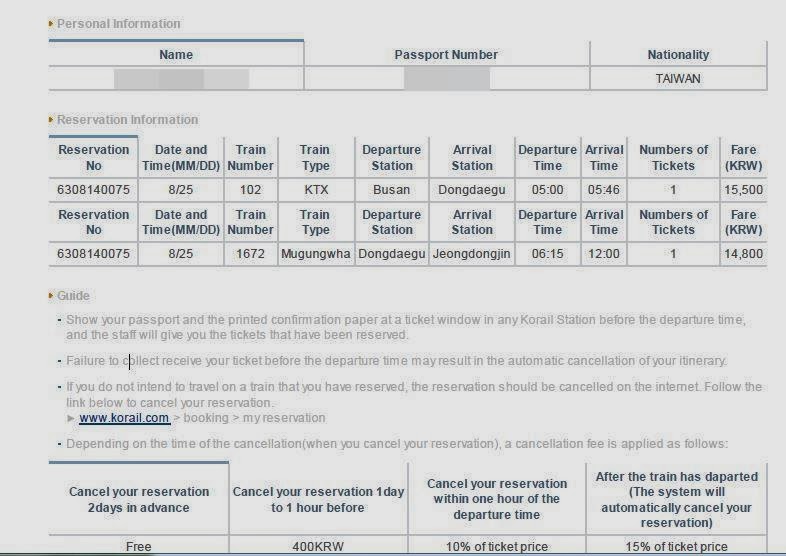 韓國訂票輸入信用卡號但並不會扣款,等實際拿票後才會真的扣款。所以在出發前有想改班次或是取消班次,都可以上往作取消的動作。