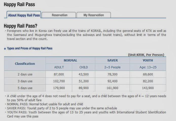 韓國火車有兩種套票,KRPASS和Happy Rail Pass,和歐洲火車套票一樣,越多人搭票價越便宜。KRPASS是讓短期(6個月以下)在韓國的外國人使用;Happy Rail Pass是讓在韓國居住的外國人使用。