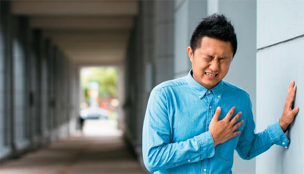 胸前有劇烈壓迫感,有如百斤大象踩在胸前的悶痛,甚至會轉移到左肩、下巴、手臂,可能伴隨著喘、噁心感或冒冷汗。
