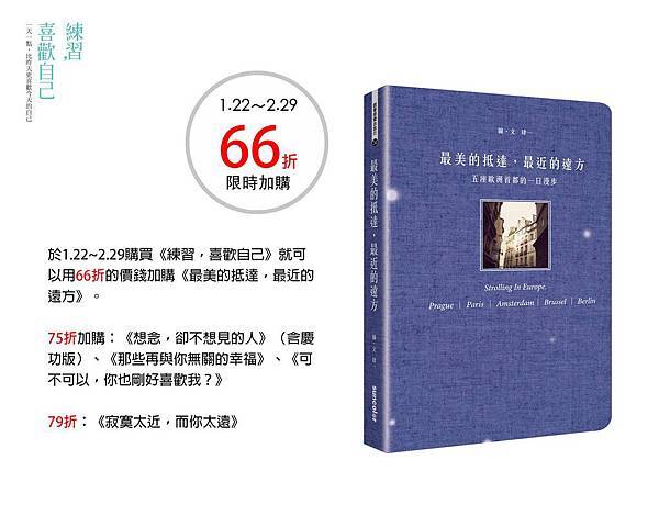 因此,搭配《練習,喜歡自己》新書上市,從預購日開始至2.29,只要購買《練習,喜歡自己》就可以用66折的價錢加購《最美的抵達,最近的遠方》,再強調一次是「限時」喔。