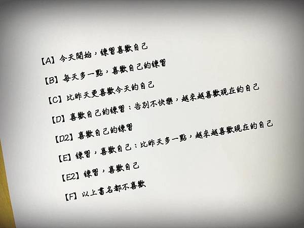 「畫一個表情來表示今天的心情、用一個月練習一件事、寫一句話來給自己打氣,用簡單的方式,一天一點點、今天比昨天好一點,然後一年後再回顧自己一年來的變化,是不是更喜歡自己了?」