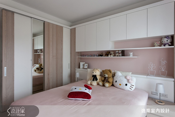設計師表示主臥房的規畫以女屋主的喜好為主,以粉色系規劃整體空間,也在主牆面後方預留層板空間給女屋主收藏的Hello Kitty。