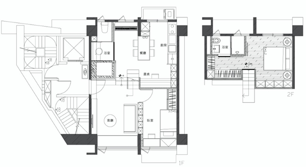 不到 18 坪的空間,卻擁有 3 房 2 廳。夾層樓梯設計在電視牆的兩側,雖然分做兩個梯,但是設計師將上下樓至主臥及客房所需要的迴旋空間巧妙融入客廳,通通變成客廳的一部分,讓空間使用率極大化。樓梯扶手則嵌進牆壁之中,完全不浪費空間。