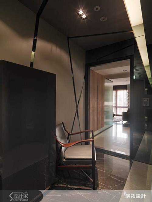 雖然每戶都有獨立室外玄關,但是空間並不大,設計師利用鏡面反射材質讓空間放大,再透過線性切割裝飾,凸顯現代感。不經意放置的單椅,其實是為了長輩出入穿鞋使用。