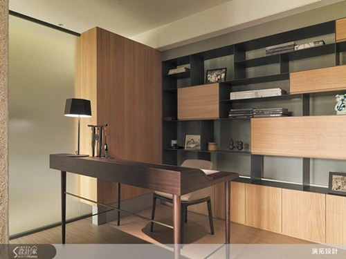 孝順的兒子貼心地為父親準備一間寫書法專用的書房,設計師運用透光玻璃隔間引進採光,佐以質樸的石材牆和客廳區隔,再運用展示收納機能兼備的木質書櫃,建構溫暖而現代感十足的書齋。