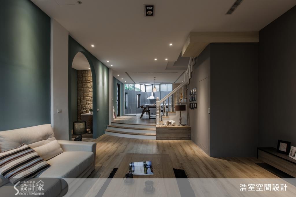 一進入大門,就馬上顯現那跟一般居住空間大不相同的巧思。藍色的拱門和白色的樓梯扶手,令人聯想到蔚藍的地中海風情。挑高的天花板,搭配讓空間感加乘,搭配蜿蜒的樓梯設計,略帶設計感的天花板,營造出的是一般小坪數沒有辦法做到的推疊和層次。