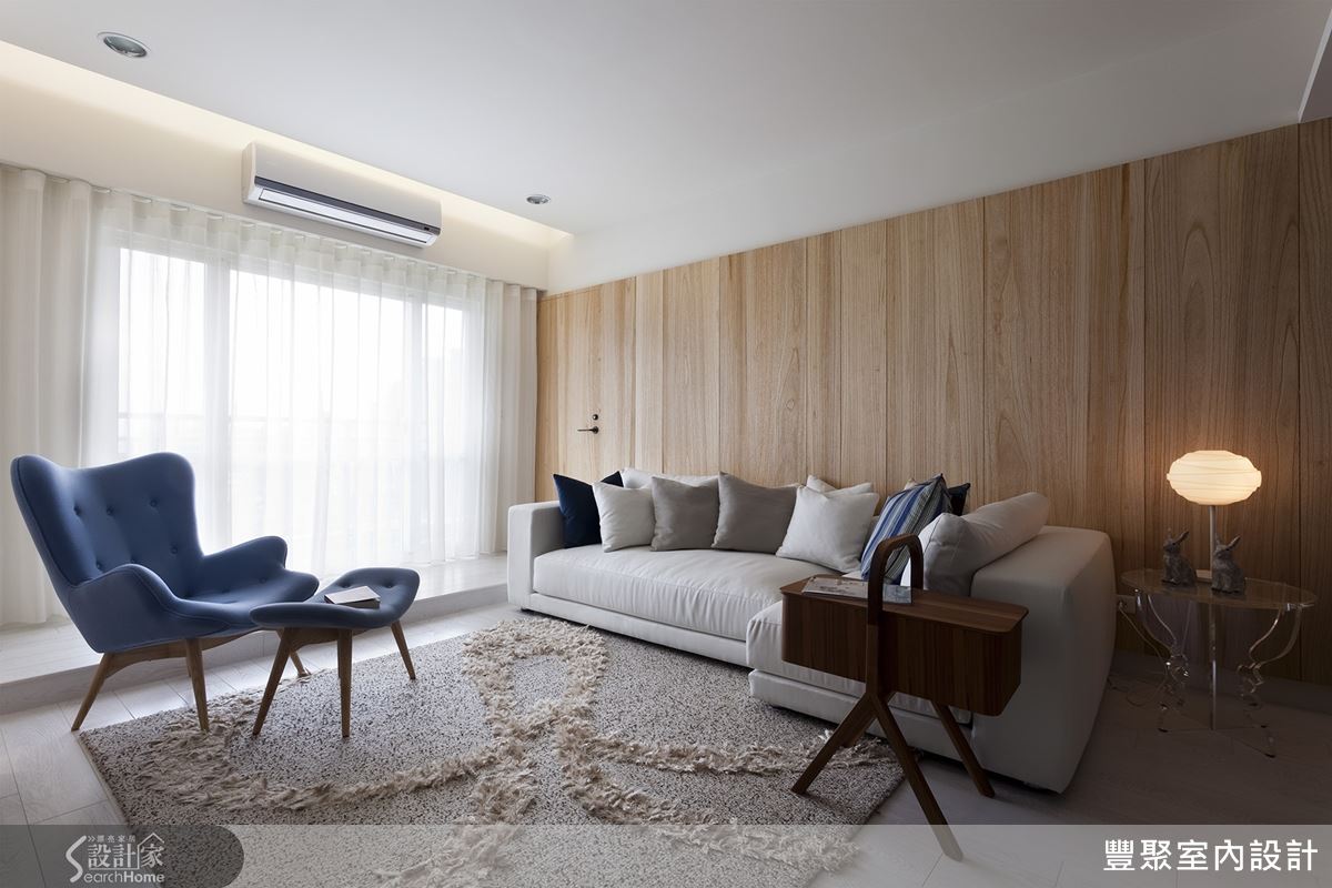 空間破解重點 01 .客餐廳合一的格局,運用梧桐木皮背牆延伸空間感