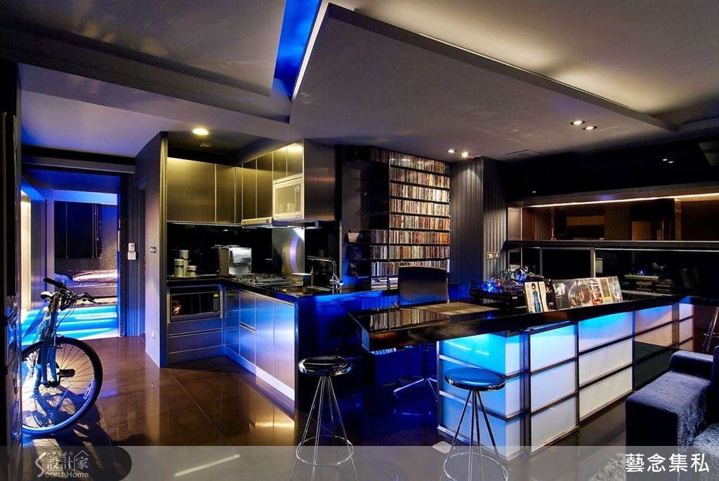年輕屋主經營出版社,假日與父母同住,收藏了很多黑膠唱片,是個音樂發燒友,甚至還有很多專業的設備。他不喜歡上夜店,也不愛吃吃喝喝,只想要有一個自己的秘密基地,在這裡播放自己喜歡的音樂,甚至和三五同好一起聆賞,這也是他平日紓壓的方式。設計師以不鏽鋼打造小而機能十足的廚房,結合展示唱片櫃,金屬加藍光,超有時尚感。音樂吧檯有著設備主機與操作面板,延伸出的小平台檯,是他平日用餐的地方。全屋以藍光為照明,斜步道後方是臥室,是一個非常個性化的空間。