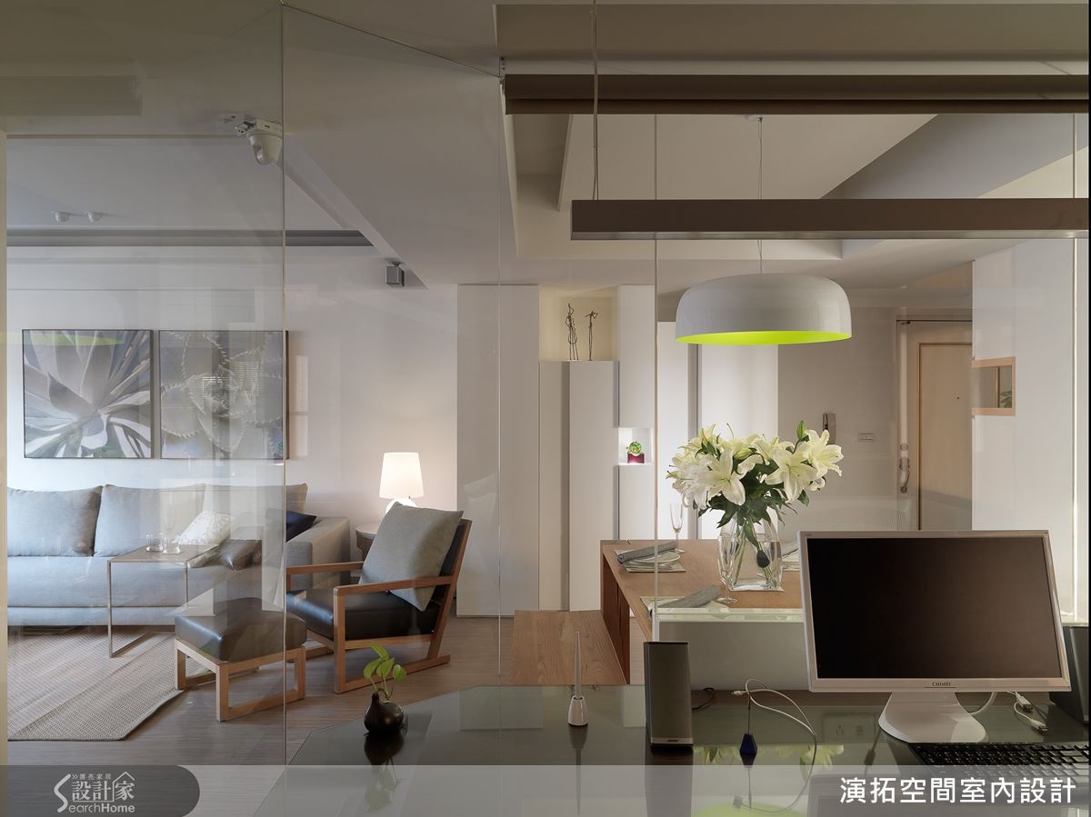 其次,善用穿透材質做隔間,也可減輕空間壓迫感。在演拓空間室內設計的作品中,經常出現緊鄰客、餐廳,如玻璃盒子般的書房設計。巧妙的玻璃隔間,讓空間在視覺上連結,卻有實際隔音效果,若增設窗簾,又能保有隱私。甚至臥房與更衣間、衛浴之間,也經常運用灰玻等材質隔間,藉此達到空間界定、串聯的效果,又不會有制式隔間牆的壓迫感。