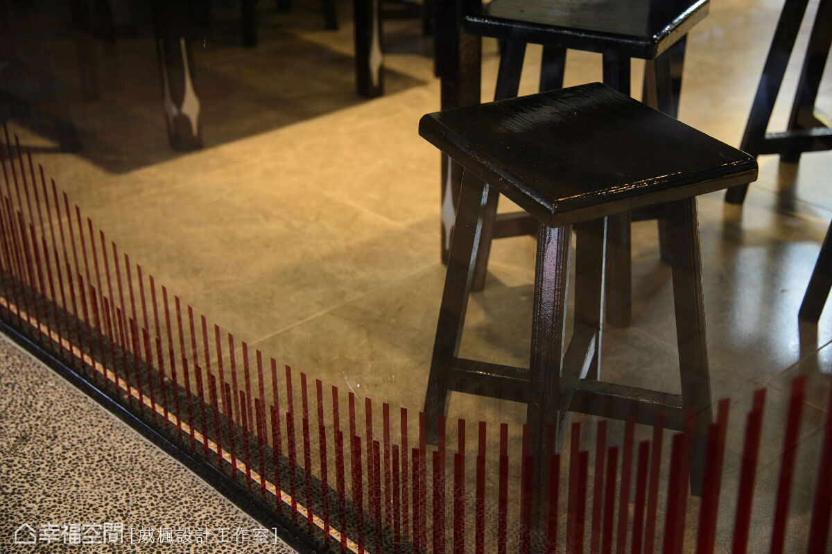 結合現代元素與傳統內涵,威楓設計工作室利用顏色來表現,首先將傳統紅色木桌,重新刷上具現代感的黑色調,展現沉穩的時尚氛圍,而帶中式韻味的紅色元素,則藉由牆面的局部點綴,巧妙帶出傳統東方意涵。