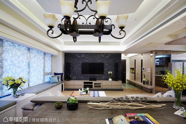 地坪雖不是室內空間的主要視覺區塊,卻是能左右整體空間氛圍的重要背景,境庭國際設計建議可捨棄亮面的拋光石英磚,在客廳選用木紋磚呈現自然的氛圍,輔搭從玄關延伸的綠色系石材地坪,營造出微風徐徐的草原自然意象。另外,包含家具、窗簾以及皮革等軟件傢飾也可採相同大地色系,使整體更為放鬆休閒,若能在客廳加上壁爐的設計,不僅在冬天有實際的暖房功效,同時也增添視覺上的豐富性與休閒渡假的感覺。