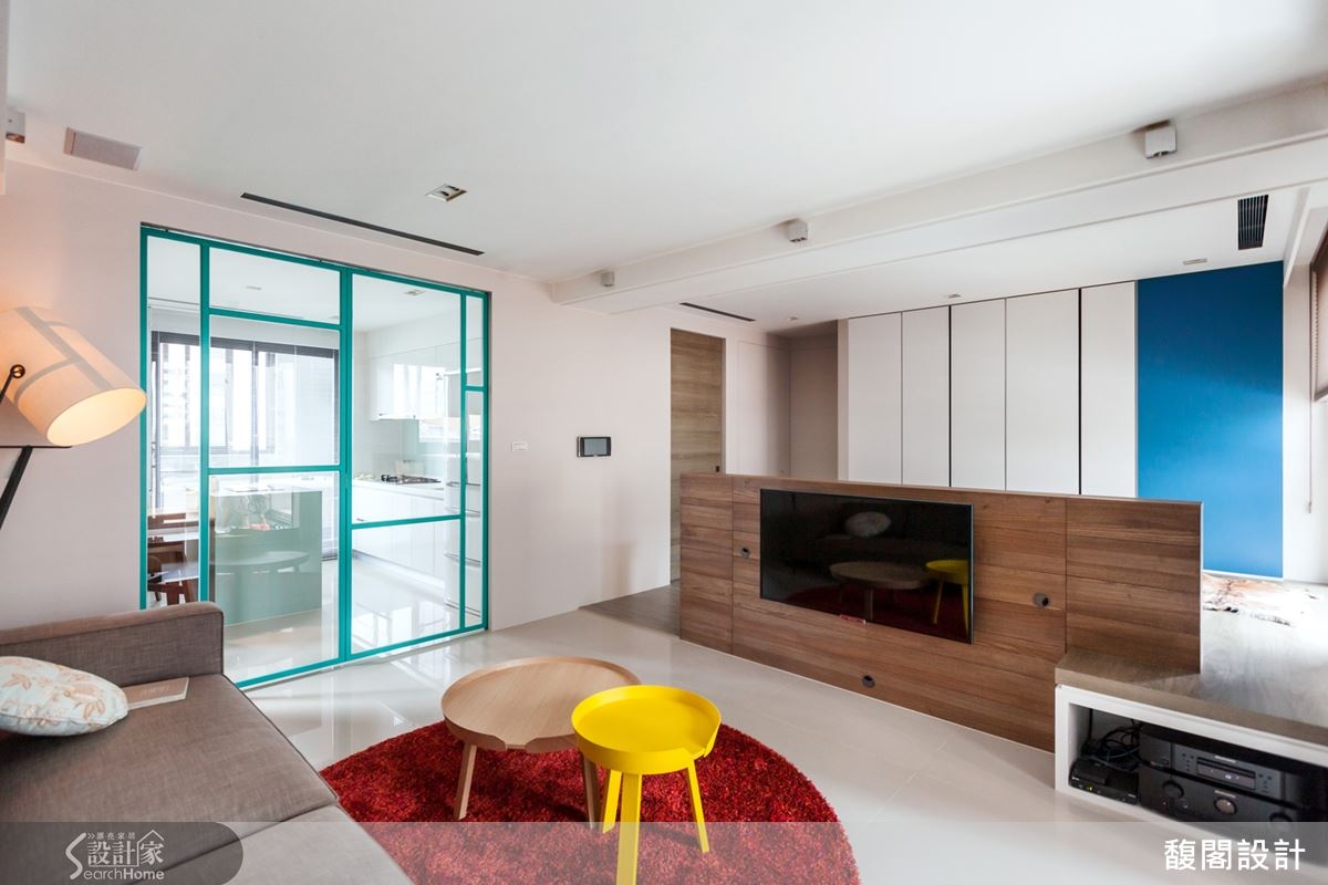 位於都會區的住宅,以開放式格局,搭配低檯度電視牆及不同材質的地坪區隔書房、客廳,讓採光、通風變好,視野無死角。