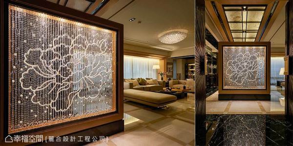 ▲玄關屏風:象徵家族的牡丹家徽轉化為巨型屏風的迎賓視覺,中央搭以施華洛世奇水晶的簾幕與LED燈,華美登場。