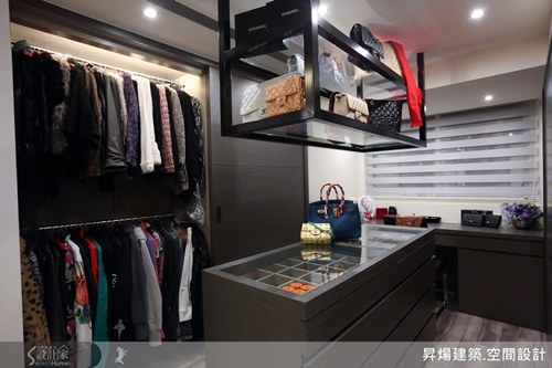 小坪數也能擁有精品店級的更衣室。兩側設置高櫃收納衣物,中島與懸吊櫃則使用玻璃可以展示首飾皮包,後方窗檯則作為精巧的化妝檯,每一寸空間都充分利用。