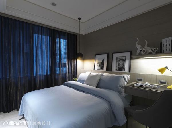 調性沉穩的主臥室以皮革軟繃打造床頭牆面造型,上下端刻意留空打光,增加視覺的輕盈之美。