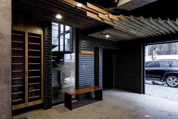 客廳、餐廚區以開放規劃的型態呈現,但此案無論公、私領域,都能看見法蘭德設計團隊出色的複合媒材應用技巧,例如客廳鐵件、實木櫃體與鐵灰色地磚,調和洗練的極簡現代風情,餐廚區多了質樸文化石背景、黑板塗鴉區,整個味道也跟著趨於休閒,一樓車庫則換上黑色立體磚、木質格柵、金屬網片等摩登工業元素登場,賦予不同樓層、機能單元同一主題、但各有表情的生活美學實踐。