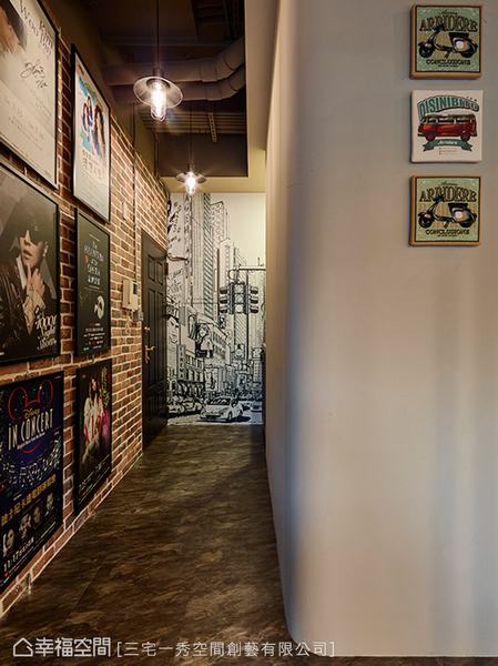 會議室是屬於腦力激盪的地方,自然也不能過於單調制式,因此郁琇琇設計總監特別在造型與色彩上做出變化。天花板採用菱形切割造型呈現,高低起伏摺面與鮮黃跳色,讓視覺更有立體層次;紅磚色文化石牆則嵌入一面黃色烤漆手寫板,方便隨時記下靈光一閃的好點子,散落水滴狀的造型,也讓會議空間富有趣味性。另因業主相當喜歡日本動漫,故在廊道段落、總經理辦公室,都以大圖輸出呈現經典動漫主題,或是在牆面掛上風格鮮明的藝術作品,成功營造出「嬉皮工業風」的趣味性辦公空間。