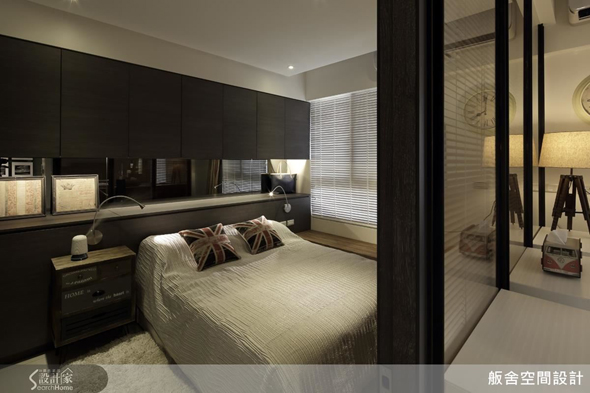 公私領域間運用穿透性材質搭配金色百葉,可隨需求開放來延伸空間視覺。臥室壁面結合了收納功能的床頭櫃,中間藉由鏤空形式創造出空間的立體與層次,也可做為展示檯面使用。家具軟件的搭配上選擇以輕工業風格為主,整體而言依舊延續設計師所喜愛的俐落、簡潔調性。