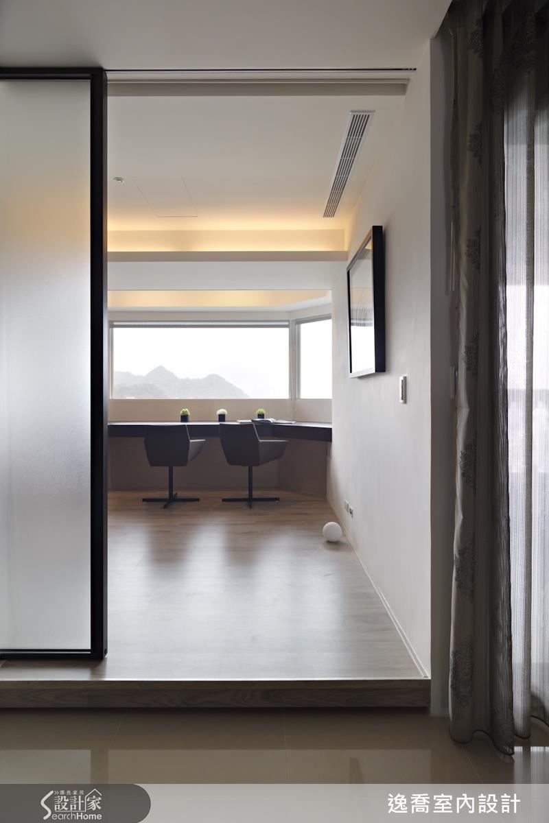 一般小家庭的空間落在 30~40 坪左右,但要居住 3~6 人甚至還要再多,空間容易顯得擁擠,若要兼顧每個空間,便容易切割的狹小又無法發揮空間效能。逸喬設計提出「多功能空間利用法」,將該空間做為多功能型態使用,例如可書房與客房並用,平日作為書房使用,若有客人來住,可挪為客房,只要利用架高木地板將空間區隔開來,輔以拉門設計,隨時都能成為一間獨立的小空間。或者都不使用時,也可以把拉門往兩側推開,成為遊戲室、休憩區,又能讓房內房外得以延展,開啟朗闊的視覺感受。