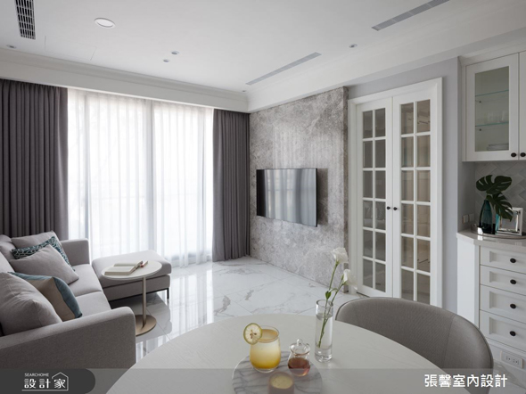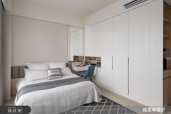 對於新婚夫妻而言,住宅不僅要想到現在的生活需求,更要預留未來養育孩子的空間,因此室內首先將電視牆與沙發位置對調,並刻意弱化電視牆的比重,讓夫妻倆能享有開闊的公領域視野。而電視主牆後方,規劃為半開放式的多功能室,兼具書房、遊戲室和客房等機能,且透過室內開窗的方式,強化空間明亮感。臥室則藉由一整排衣櫃,滿足夫妻倆的收納所需。
