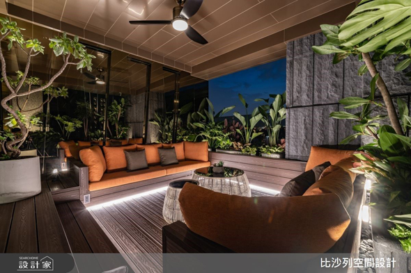 此案居宅坐落於北市精華地段,有著絕佳的城市光景,比沙列空間設計為了發揮最大優勢,將戶外陽台形塑為愜意的度假氛圍,以降板設計明確場域分界;外圍放上大型植栽,兼顧綠意美化及居家隱私感受;上方天花選用耐潮的塑鋁板,讓戶外空間不在成為清潔死角;最後設置沙發休憩區,提供夫妻倆一處早晨閱讀、夜晚品酒的休憩角落。