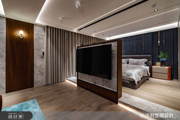 主臥房為睡眠區、起居室、更衣間及衛浴四空間組成。睡眠區的床頭立面選用霧灰藍調仿皮革材質及金色飾條妝點,定調私領域的獨特表情,同時於場域中心設置半高電視牆,形塑彈性多元的回字型動線,更以架高睡眠區地坪區隔睡眠區與起居室的分野;後方更衣室結合化妝台機能,以充裕的收納空間滿足夫妻倆的生活需求;最後,主衛浴以四件式機能,融入獨立浴缸、蒸氣室、烤箱機能,讓兩人盡享放鬆的沐浴時光,於此處將一天的辛勞疲乏拋諸腦後。
