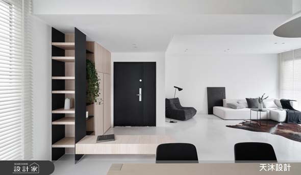 因應此需求,天沐設計在公共區域使用純白烤漆櫃牆,搭配銀狐大理石及霧黑鐵件,以簡約手法將海量收納系統化為背景,連續量體演繹出空間的層遞漸進,大幅延展了客廳尺度。客廳淺色木地板作為純白與霧黑的調和劑,大面落地窗配置紗簾搭配鐵灰色布簾,輔以均勻分布的人工光源,在簡約個性設計中注入節能精神。