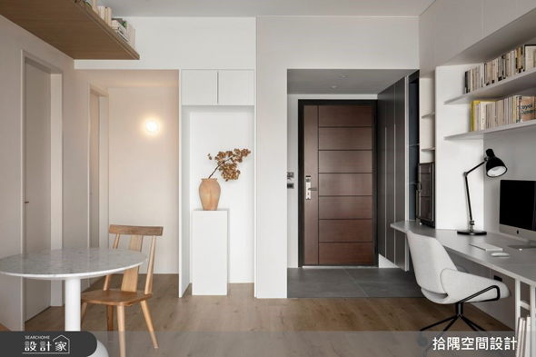 本案屋主長時間在家辦公且看電視的頻率較低,設計師改變了傳統格局安排,把大型空間留給需要長時間使用的區域,以工作室作為空間中心,進門即迎接長型雙人書桌區,後方則安排圓形小餐桌,打造小巧用餐空間。