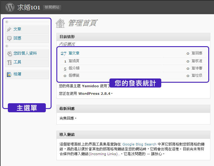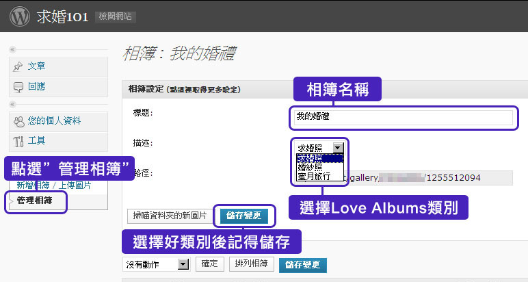 於主選單上點選”管理相簿”,會出現相簿設定的資訊,標題為您所創造的相簿名稱,在”描述”的下拉式選單可歸類您想放置的類別後,按”儲存變更”即可
