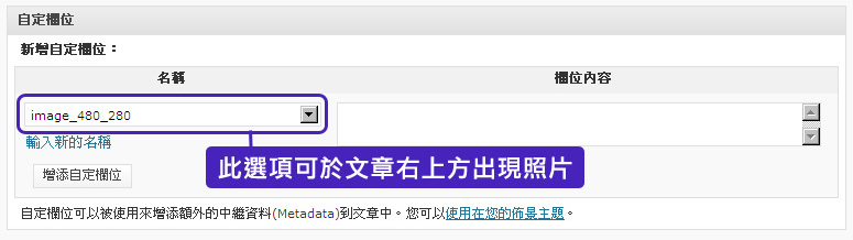 於新增文章下方,選擇”自定欄位”,名稱選擇”image_480_280″,上傳圖檔後可在文章右上方出現您所上傳的圖喔
