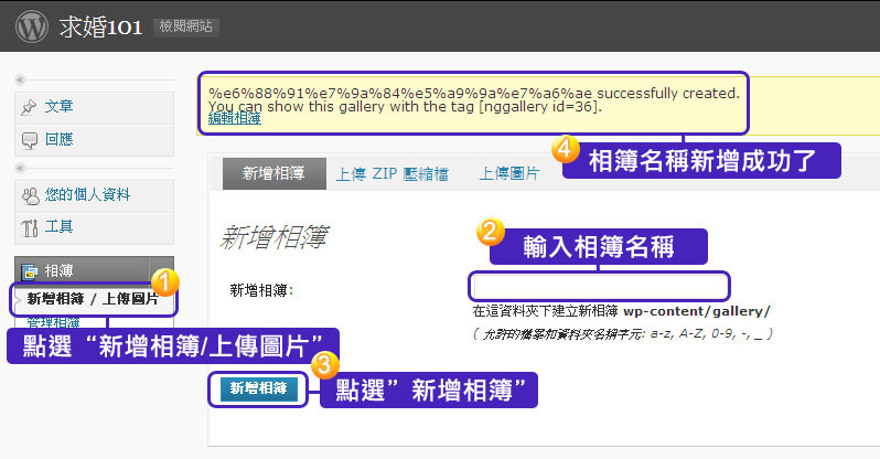 於主選單上點選”新增相簿/上傳圖片”,輸入相簿名稱後,點選下方”新增相簿”,下圖出現黃色區塊訊息表示您的相簿已新增成功