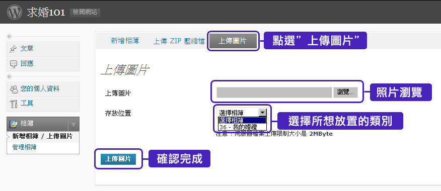好不容易將自己感人的故事及美美的圖片製作完成後,最後一步就是上傳啦~~趕快讓大家看您的精采故事吧!