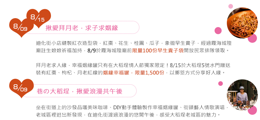 大稻埕在政府多年的規劃下,讓一年一度的大稻埕音樂煙火節變成是台灣等世界各國民必去朝聖的重點節目,活動當天都會湧入將近十萬以上的人潮,就是為了紀錄煙火在天空中綻放的美麗,更有許多攝影師就是為了捕捉這一刻的煙火奇景,今年2015年大稻埕音樂情人節特別將結合七夕情人節活動的,來創造出前所未見的視覺震撼與聽覺饗宴的表演,融入了藝術、科技、文化、等創意規劃,再加上幸福滿滿的情人節元素,藝人演唱感動人心的抒情歌曲,讓人絕對會愛上今年的台北大稻埕音樂情人節活動,並渡過美好的七夕情人節。